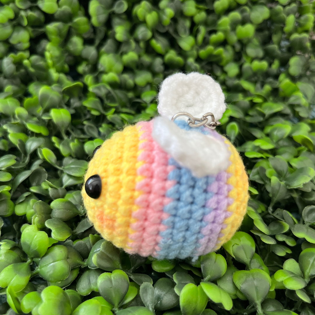 These adorable keychains feature two fuzzy bumblebees with vibrant yellow and black stripes, each with a tiny crocheted stinger and delicate wings. Suspended from a sturdy keyring, these cheerful bees accompany you on all your adventures, spreading joy and positivity wherever they go. Whether attached to your keys, backpack, or purse, let the "Bumble Buzz Bees" brighten your day with their playful charm and infectious buzz.