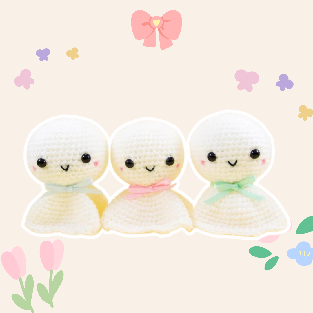This is a crochet keychain called "Ghostie," featuring a cute ghost with black bead eyes, blushing cheeks, and a small smile. Its soft, flowing design gives it a friendly and adorable appearance.