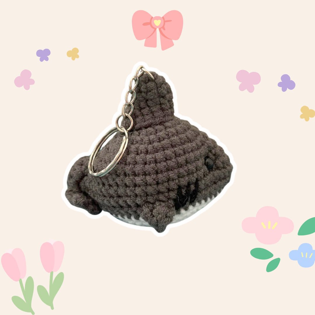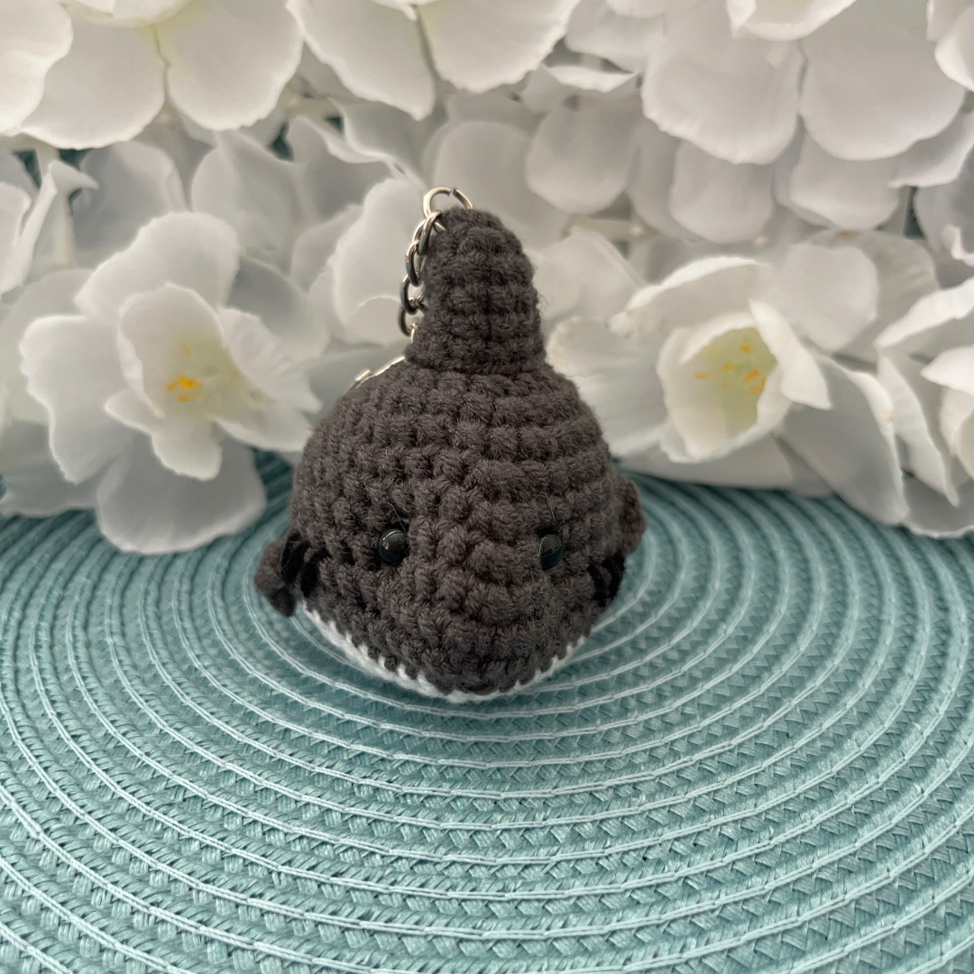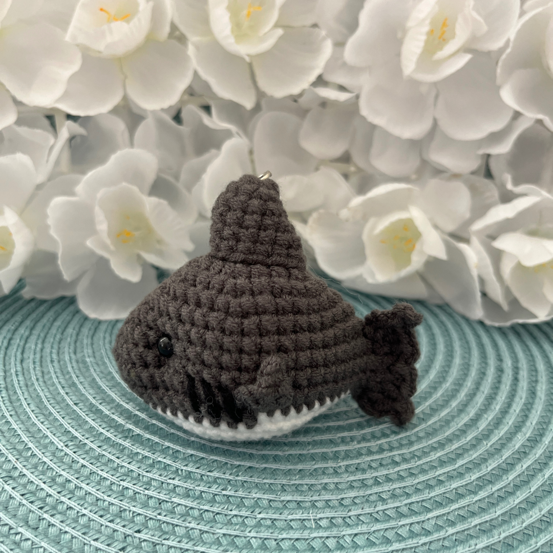 This is a crochet keychain of a shark, featuring bead eyes, a fin, and a small tail. Its textured design and details give it a cute and friendly appearance.