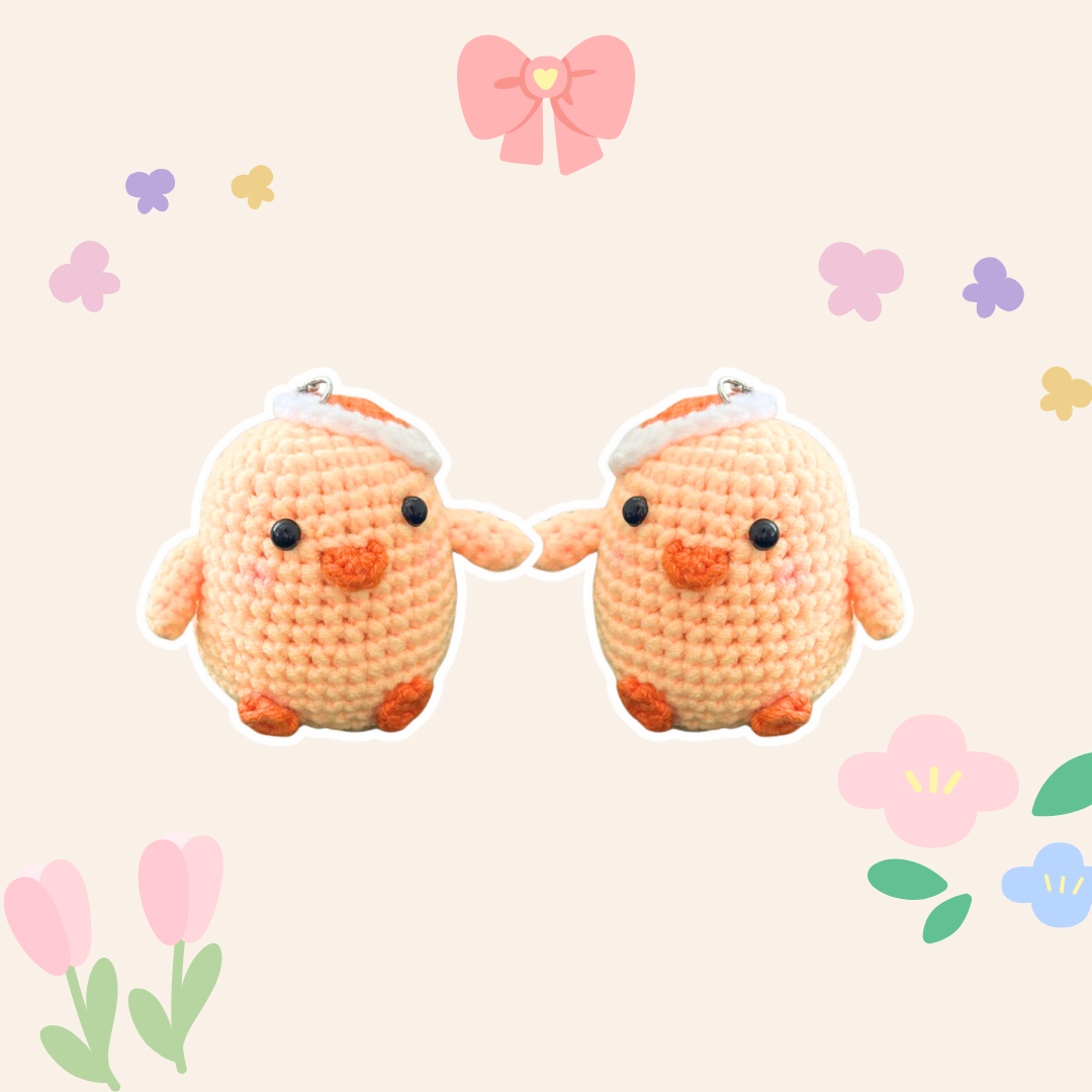 This adorable crochet chick keychain features a tiny hat and cheerful expression, perfect for adding a playful touch to your keys or bag.