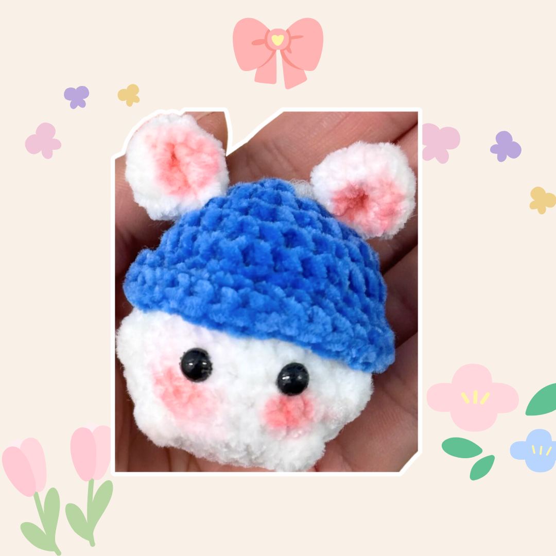 This crochet keychain features a cute, fluffy character with black bead eyes, blush cheeks, and a cozy hat in different colors: red, pink, purple, and green.